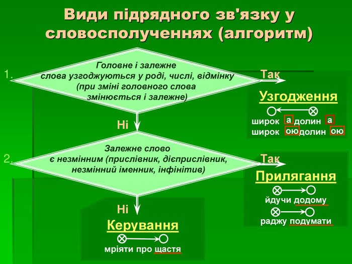 - Узгодження (гарна дівчина) — залежне слово змінюється разом із головним.